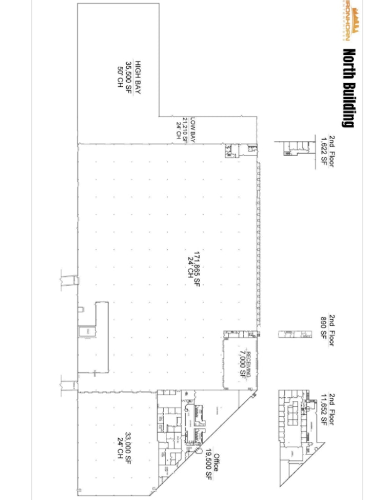 North Building/North Building High Bay - ±250,000 square feet of space with a 24-foot clear ceiling height. ±35,000 square feet of high bay space with a 50-foot clear ceiling height. This design provide sample room for large-scale operations, such as high-clearance storage, manufacturing, or distribution.