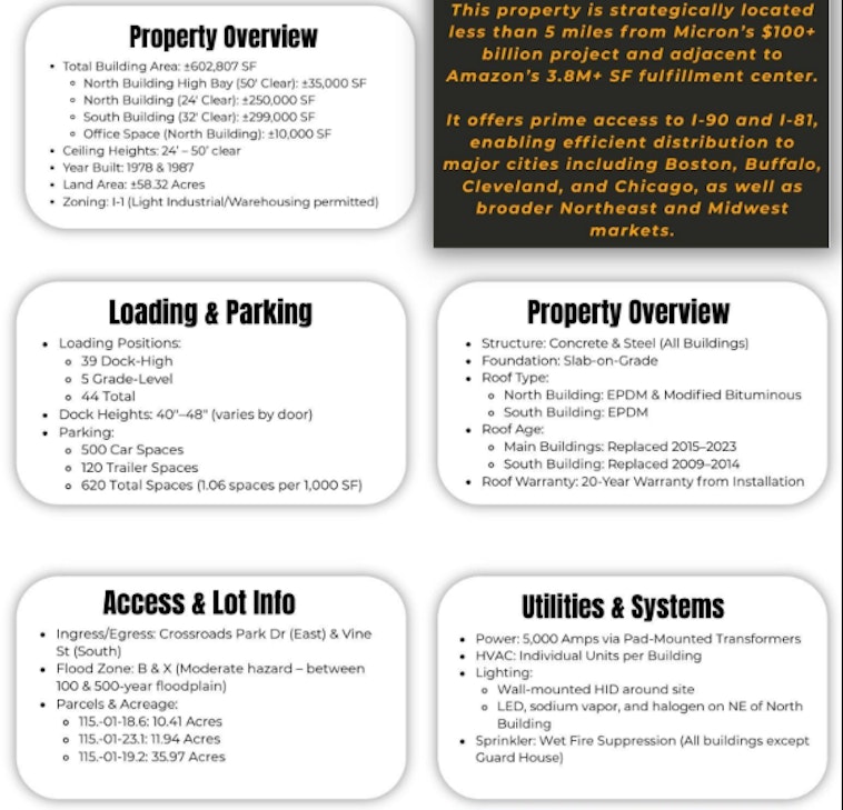 7245 Henry Clay Blvd is a ±602,807(minimal divisible 80,000 SF) industrial distribution/warehouse facility situated on ±58 acres with 24-50 FT clear height in Liverpool, NY, just north of Syracuse. The property features 120 trailer parking spaces and excess land for further development. Its strategic location places it less than 5 miles southwest of the $100+ billion Micron Semiconductor project at White Pine Commerce Park and immediately west of the new 3.8M+ SF Amazon Fulfillment Center. Positioned centrally to key regional distribution routes, it provides easy access to major highways including I-90 (east/west) and I-81 (north/south), facilitating seamless connectivity to Boston, Buffalo, Cleveland, Chicago, and beyond.